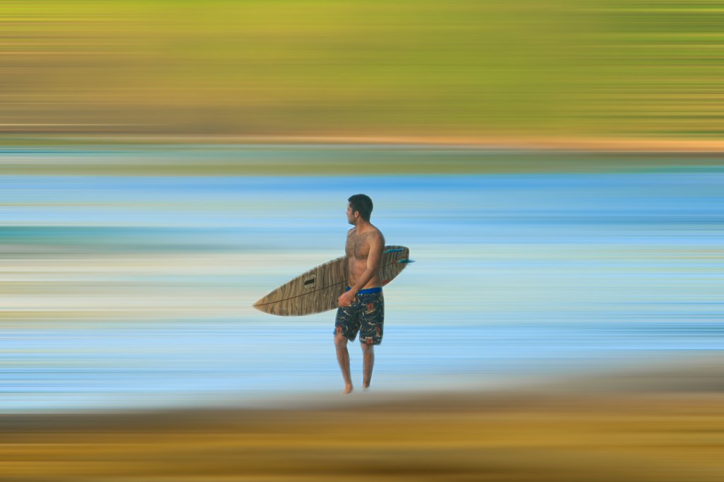 Here’s one that is really easy to create and the result is pretty dreamy. I selected an image that had sand in the foreground, the ocean in the middle, and a hillside in the background. I isolated the image of the surfer and then applied a blur filter to the remainder of the image. Using the sliders, one can use as much or little blur as needed to create the desired effect. The color combo on this image reflected the jungle tones and complimented the board shorts!