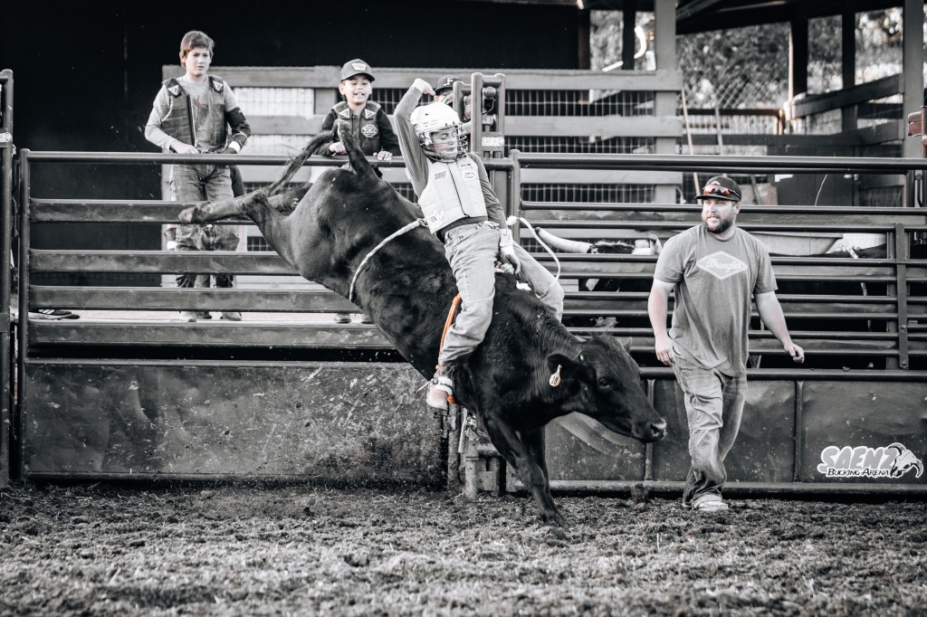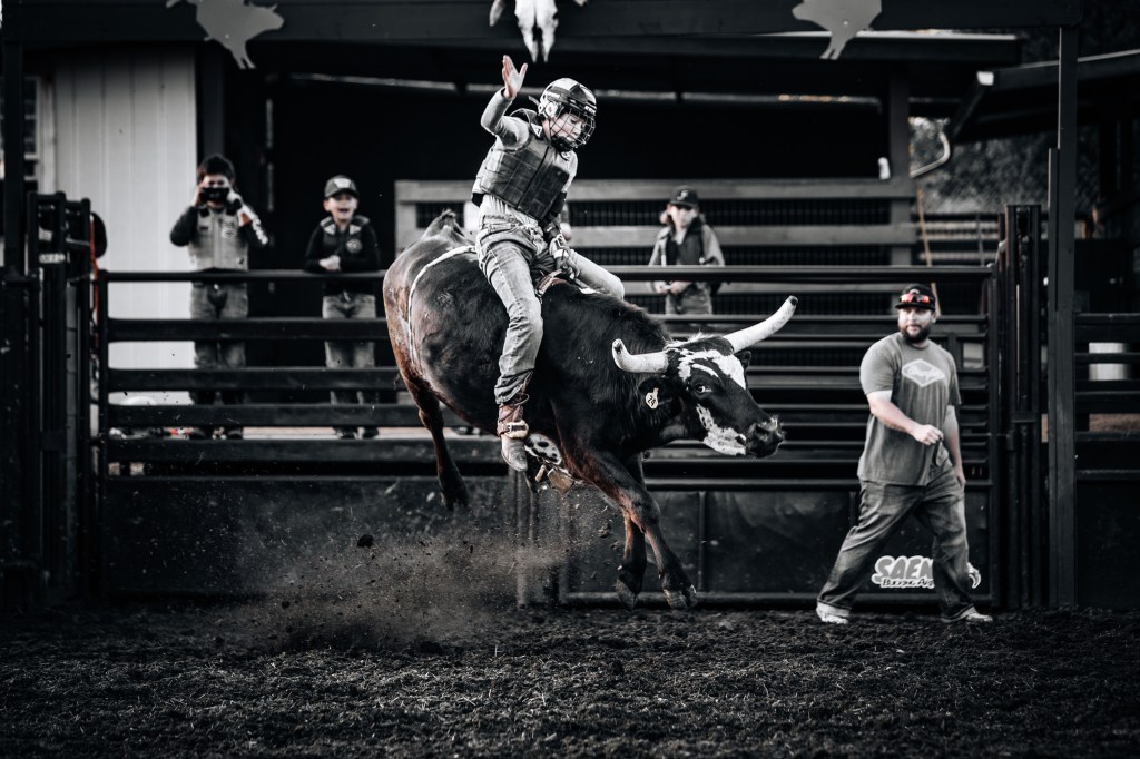 Out of the chute, the bulls waste no time kicking high, spinning, and trying to launch their rider. The boys work the shifting and lunging weight with their own countermoves while holding on with strong legs and one hand. Style and form go hand in hand.