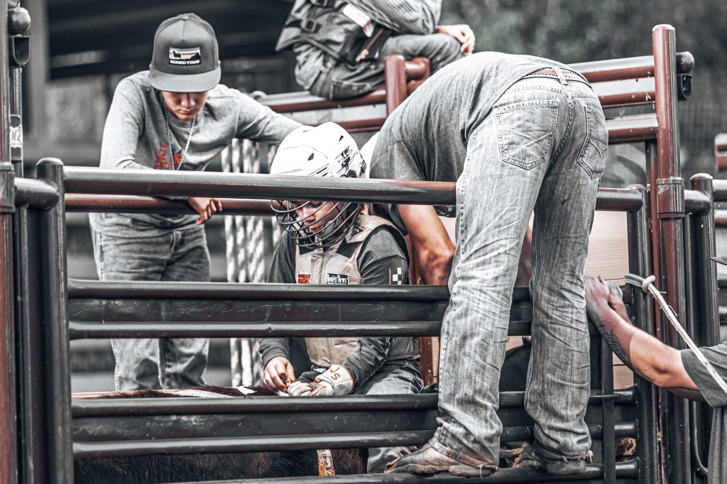 Over the next few hours, I watched as five dads assisted five young men still in their teens prepare for their rides on a series of mean looking bulls. The preparation is impressive. The boys are responsible for their own gear and spend time getting their bull rope and glove sufficiently tacky with just the right amount of rosin. They don protective vests, boots, and helmets. They limber up and then psych up for each ride. With instruction and encouragement, the gate is swung open and the adrenaline surges.