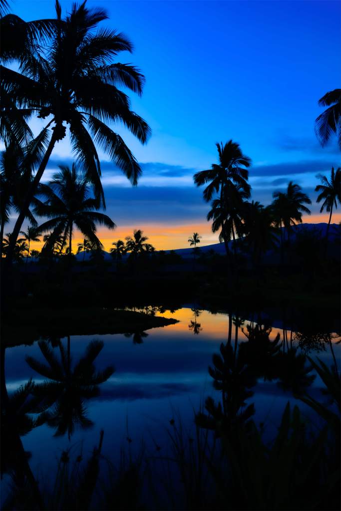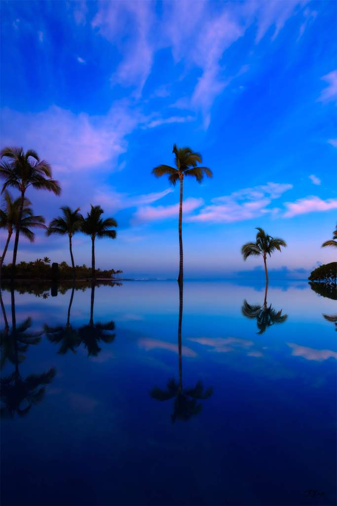 It is such an expansive landscape, I initially struggled to figure out how best to photograph it. But then I took a walkabout during the Blue Hour – that time right before the sun rises. Walking in the dim light helps one focus on shapes and here the palm trees rose to the occasion, both figuratively and literally! Reflections became my go-to as I was mesmerized by the changing colors in the sky and water. The image above I now call “Sunrise Palms.”